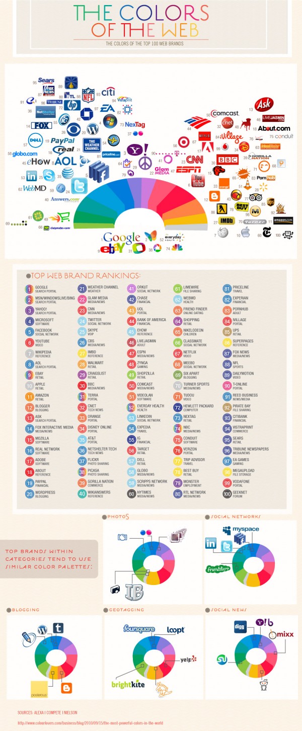 A little over a year ago, the folks at Colourlovers took a look at the logos of the 100 largest online brands to see which colors are most popular. Turns out the majority use blues and reds. No surprise there. Blue communicates trust and authority. Two very good associations for online brands. Likewise, red commands attention and represents leadership. It’s no wonder they dominate logo colors.